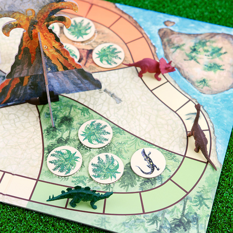 이 게임에는 공룡피규어가 들어있고 입체적인 화산모형이 있어요.